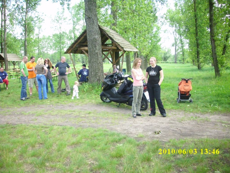 Tak czy inaczej kiedy nastał nowy dzień, pojawiły się nowe wyzwania. Trochę nowych konkursów, wycieczek i atrakcji zlotowych. Pierwszą atrakcją było śniadanie. Jedni po nie poszli, innym przynieśli. Bogowie musieli do nas zstąpić zapewniając nam pogodę iście śródziemnomorską. Jednego na pewno widziałem, nie wymienię tu jego ziemskiej nazwy, bo jeszcze zesłał by na mnie klątwę, ale w starożytnym Egipcie nosił imię Chepri. W tekstach staroegipskiej Księgi Umarłych ma związek z symboliką zmartwychwstania. Miał tajemną moc ciągłego odradzania się. Już wiecie o kim mówię ? Co noc widziałem jak umierał, a rano był żywy. Wracając jednak do zlotu, w coraz mocniej świecącym słońcu, rozpoczęły się kolejne konkursy. Zaczęliśmy konkurencją skuterową czyli przejazd między ciasno ustawionymi słupkami, mini slalom, a po nawrocie szybka prosta i precyzyjne hamowanie. W konkurencji wzięło udział łącznie 35 osób. W kategorii mniejszych pojemności czyli umownie do 350ccm wygrała Karolina, dlaczego mnie to nie dziwi, z czasem 13,14 sekundy, później żaliła się, że ma rolki do wymiany więc skuter kiepsko przyśpiesza. W kategorii większych pojemności, od 400 wzwyż wygrał Dzięgiel na AN-e 650 z wynikiem 12,62 sekundy. Równolegle z tą konkurencją rozgrywana była konkurencja trafiania tarczami hamulcowymi w opony. W tej konkurencji wzięło udział 55 osób, a wygrała Ssylwia, celne oko ma dziewczyna, mam nadzieje że nie ćwiczy tego w domu, rzucając talerzami.