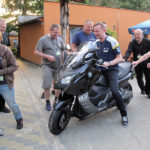 Choć nasza główna impreza na dobre miała rozkręcić się od piątku, gdzie przez cały dzień na miejsce naszej sztandarowej imprezy zjeżdżali się pozostali uczestnicy X – jubileuszowego zlotu Burgmanii. Pojedynczo, parami, małymi grupkami i wielkimi grupami, choć jedna grupa na pewno wyjątkowo zapadła w pamięć tym co widzieli ich wjazd. Mowa o grupie Kujawsko – Pomorskiej która w wielkim stylu dojechała na zlot i bynajmniej nie chodzi o liczebność grupy, a styl w jakim wjechali na teren ośrodka. Jak to na każdym zlocie bywa, rejestracja, identyfikator na szyje, uśmiech i uścisk i można zacząć się bawić. A najlepsza zabawa jest wtedy kiedy bierze w niej udział duża grupa i do tego można jeszcze spróbować rywalizacji z innymi, celem osiągnięcia korzyści majątkowej w postaci nagrody choć by w konkursie siłowym, jakim było przeciąganie liny.