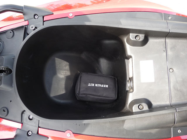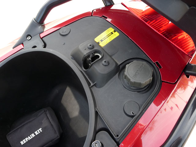 Na tym polu Gilera nie błyszczy. Nie znajdziemy tu żadnego (!) schowka w okolicy przedniej owiewki i jedynymi przedziałami bagażowymi będą: schowek pod kanapą plus opcjonalny (drogi) kufer. Schowek pod kanapą jest porȯwnywalny z tym znanym z Tmaxa, na pewno zmieści się w nim kask typu jet lub mały integral. W schowku znajdziemy też gniazdo zapalniczki 12V, a pod kanapą oryginalny zestaw narzędzi.