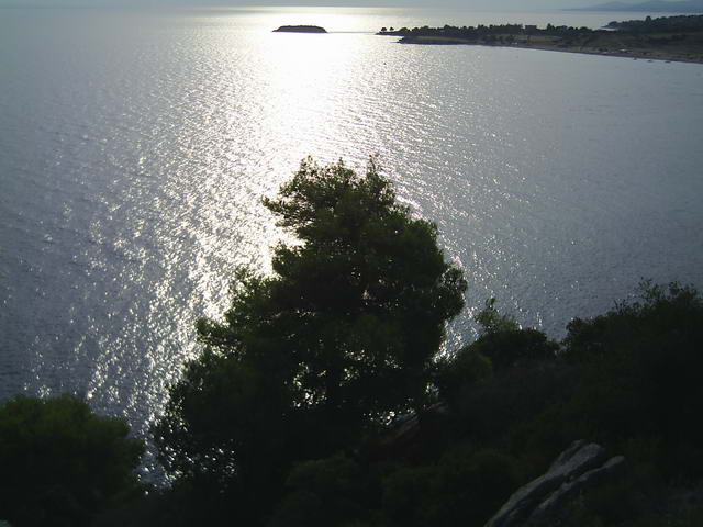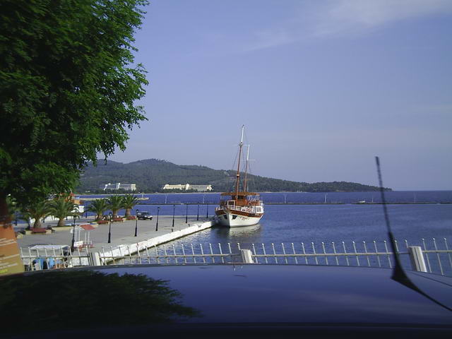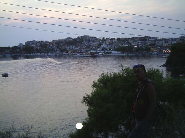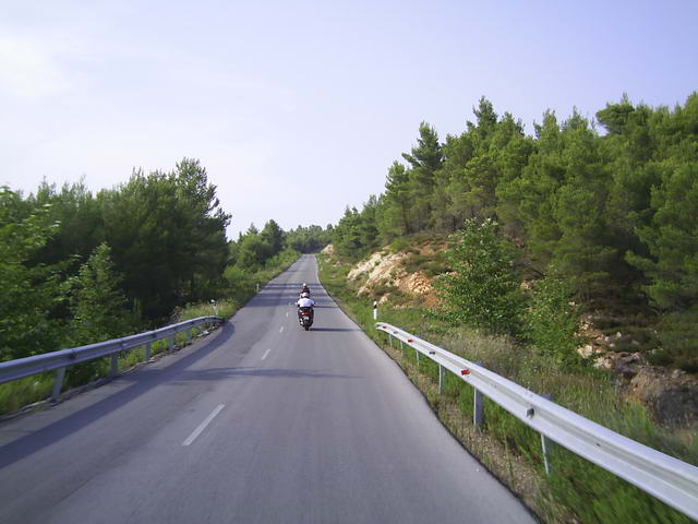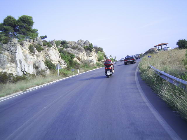 Wreszcie wyspani i pełni nowych sił, już zapomnieliśmy, że kiedykolwiek byliśmy zmęczeni. Jakie zmęczenie, to musiało być dawno temu. Do tego po śniadanku udaliśmy się na plaże potaplać się w ciepłym morzu, ponurkować, wygrzać się w promieniach Greckiego słońca. Dla tych co lubią nurkować to świetne miejsce z ciekawą fauną i florą morska. Artix wyławia pancerze jeżowców i muszelki, RobB szaleje z podwodnym aparatem, a Qwaki udaje materac leżąc w morzu. Morze jest na tyle ciepłe że po 2 godzinach taplania się w morzu nawet nie chce się wychodzić. Potem przenosimy się na basen, 20 metrów od morza, też jest sympatycznie, leżaczki, greckie piwko i słońce. Spotykamy tam Polaków, którzy odbywają praktyki w pobliskim hotelu i właśnie maja czas wolny. RobB który jest z tego znany, że lubi się uczyć miejscowych języków powoli zagłębia tajniki języka greckiego Sympatycznie upływa nam dzień na lenistwie. Właśnie, a może dość leniuchowania, na pewno skutery już się stęskniły za nami. Postanawiamy pojechać sobie do odległego o 30 km miasteczka na jakiś obiadek. Po około 10 kilometrach grecka policja kieruje nas na objazd, bo droga którą mieliśmy jest zamknięta. Nawet się cieszymy bo dzięki temu poznamy kolejne miejscowości które nie były w naszym planie. Przepiękna górska droga, ostre podjazdy i zjazdy, winkielki, wspaniała pogoda, piękne widoki. Mogli byśmy tak jechać i jechać mijając po drodze malutkie miasteczka. Niestety nasz objazd po 80 km dobiegł końca, jeszcze chwila i jesteśmy już w miejscu docelowym. Małe nadmorskie miasteczko z portem, pełne sklepików i knajpek. Udajemy się na pyszne greckie lody i mały rekonesans po miasteczku dodatkowo wypatrując jakiegoś sympatycznego miejsca gdzie moglibyśmy zjeść świeżutkie dopiero, co złowione owoce morza. Przekonuje nas do siebie szef jednej z knajpek, który słysząc że mówimy po polsku, chwali się że był w Sopocie i Gdańsku. Do tego jego żona chyba Rosjanka, w każdym razie świetnie mówi po rosyjsku. Pyszne i wyborne to były strawy, po obfitym posiłku postanawiamy zobaczyć jeszcze ekskluzywne pobliskie miasto z masą kasyn, niestety podjeżdżając pod bramę miasta, dosłownie bramę, bo miasto otoczone jest siatką z drutem kolczastym odchodzi nam ochota na zobaczenie, co kryje się po drugiej stronie płotu. Zresztą i tak jest już późno i czas wracać, liczymy jednak że po ciemku nie będziemy musieli wracać ponownie objazdem, bo ile jazda w dzień dostarczała tam wielu wrażeń to nocą była by trochę męcząca. Objazd jednak był, ale udało nas się jakoś przejechać, naciągając trochę prawdę że jedziemy to miejscowości położonej nie opodal, a dalej się coś wymyśli. No wreszcie dojechaliśmy do miejsca gdzie policja już nie puszczała dalej. Artix dowiedział się że jak poczekamy jeszcze 10 minut to puszczą nas objazdem ale zdecydowanie krótszym niż przez góry. W każdym razie udało się przejechać, jeszcze jedno małe zabłądzenie bo z tego rozpędu przejechaliśmy zjazd na camping i polecieliśmy jakieś 10 km dalej. Ech jazda bez kasku jest taka przyjemna, że nie robi nam różnicy parę kilometrów w tą czy w tą, choć w oddali słychać było jakieś grzmienie, czyż by burza ? RobBa nie udało nam się namówić na jazdę bez kasków, ale dobrze że w grupie jest ktoś kto ma odrobinę rozumu i rozwagi. Przy okazji zatankowaliśmy żeby już jutro rano nie tracić czasu i wróciliśmy na camping, gdzie na tarasie RobBa mogliśmy napić się dobrego greckiego piwka w większych ilościach i zjeść przepyszne greckie brzoskwinie których smak do dziś za nami chodzi. No i nagle lunęło, jak by ktoś odkręcił szlauch z wodą a po 5 minutach przestało. Po chwili nie było już śladu po deszczu. To był zresztą jedyny „deszczowy” dzień w Grecji. Czas spać, jutro wyruszamy dalej na południe.