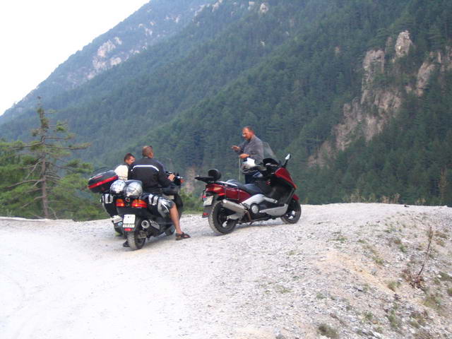 wielkości piłeczki ping pongowej. Kolejna opona do wymiany, bo lepiej nie ryzykować dalszej jazdy z taką gumą. Na szczęście to Grecja a nie Serbia i mamy nadzieje że podobnie jak RobB szybko znajdziemy inna, właściwą oponę a nie jakąś zastępczą. Qwaki który po przygodzie RobBa uspokajał się, że w razie jak by co to u niego w „Sokole” leży nowiutka oponka i w razie jak by co wyślą mu DHL. Faktycznie, jak się dowiedzieliśmy taka opcja istnieje, opona może być nawet następnego dnia w dowolnie wybranym przez nas miejscu. Jedyny mankament, że DHL nadaje chyba oponę w Business Class, bo cena za przesyłkę wynosi 2500 zł. Ja rozumiem, że komfort kosztuje, ale w końcu jedzenie i drinki dla opony nie powinny być wliczane w cenę, bo przecież ile taka biedna oponka może zjeść i wypić darmowych drinków podczas lotu. No to czas szukać miejsca gdzie Qwaki będzie mógł kupić od ręki miejscową oponkę. Znajdujemy serwis Suzuki, nie za bardzo on przypomina na podwórku serwis, raczej jakiś miejscowy szrot motocyklowy. Warsztat też nie budzi zaufania, za to zostajemy posadzeni pod winoroślami, obdarowani pyszną zmrożoną kawką i otrzymujemy obietnice, że za 2 godziny będzie nowa opona. Już gdzieś słyszeliśmy podobne deklaracje, wiec mimo że to Grecja podchodzimy do tego sceptycznie, choć w Salonikach naocznie widzieliśmy że oponę można dostać od ręki. Po 2 godzinach faktycznie jest nowa oponka i po zdjęciu starej widzimy w środku gigantyczny purchel od wewnętrznej strony opony który w porównaniu z purchlem na zewnętrznej stronie wydaje się monstrualny. Cena za oponę też typowa, ani mniej ani więcej niż u nas. Humory nam dopisują, choć słono zaczynamy płacić za gorące jak w piecu powietrze i jeszcze gorętsze asfalty. Miejmy nadzieje że to już ostatnia opona. Wszyscy żartują, że teraz kolej na oponę Artixa która w myśl logiki powinna się skończyć we Włoszech, bo w jednym kraju nigdy dwie te same rzeczy się nie zdarzają. Po zmianie opony ruszyliśmy dalej. Tym razem w poszukiwaniu campingu na Riwierze Olimpijskiej. Po krótkim wybrzydzaniu w końcu mamy gdzie spać. Nie był to może szczyt marzeń ale aż tak źle też nie było, no może z wyjątkiem domku RobBa. Jednak w porównaniu do poprzedniego campingu to nie było już tak słodko, zdecydowanie lepszym miejscem na wypoczynek jest półwysep Chalcydycki niż Riwiera Olimpijska. Po szybciutkim rozpakowaniu, postanowiliśmy jeszcze odwiedzić zaprzyjaźniony klub „Bogowie Olimpu” z siedziba na Olimpie i łyknąć trochę ambrozji. Droga na Olimp jest urocza, przepiękne widoki, ciekawa trasa, niestety na sam szczyt nie da się wjechać. Dojechaliśmy do końca asfaltu, potem winkielki, ostre najazdy i zjazdy po drobniutkich kamykach zniechęciły nas do dalszej jazdy. Do celu już nie wiele zabrakło ale i godzina późna się robiła więc czas było wracać na jakieś pyszne żarełko. Obok naszego campingu w knajpie najedliśmy się do syta, no może nie wszyscy, bo próbując potraw jak leci i to losowo, Qwakiemu przypadła jakaś trawa w sosie którą miejscowi zajadali się strasznie. Do tego rachunek jak za uginający się stół był śmiesznie niski, dobre choć to bo camping był zdecydowanie droższy niż poprzedni. Jutro bez gratów planujemy wypad do mnichów, odwiedzić sławetne klasztory „Meteory”.