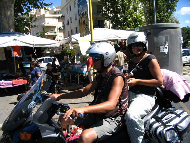 Koniec wakacji dla skuterów, ale nie dla nas. Poranne pakowanie i opuszczamy nasz sympatyczny camping. Jedziemy znowu zwiedzać Rzym, tym razem w stylu włoskim, czyli na skuterach. Koniec też błądzenia, bo za przewodnika mamy Vic’a. Najpierw włoskie śniadanko, kawka i rogalik, potem jazda po Rzymie i to jaka jazda. Qwaki i Artix byli zachwyceni, RobB włączył tryb prowadzenia Kamikaze i zaczęła się zabawa na całego. Mimo tak szaleńczej jazdy jednak nie widać porozbijanych skuterów na każdym skrzyżowaniu. Gdyby ktoś wybierał się na jazdę skuterem po Rzymie dobrze jest sobie poćwiczyć w Warszawie z tym że w Warszawie dochodzi jeszcze jedno ryzyko, w tym mieście w przeciwieństwie do Rzymu nikt nie uważa na motocykle przy zmianie pasa. Podczas zwiedzania Wiecznego Miasta Vic pokazał nam ciekawy obelisk, okazuje się, że do dziś stoi tam pomnik Mussoliniego, widać Benito czymś się zasłużył, że do dziś ma pomnik. Wreszcie też jesteśmy na tak długo szukanych schodach Hiszpańskich, których za nic nie mogliśmy znaleźć poprzedniego dnia, a warto naprawdę było je zobaczyć. Pamiątkowe zdjęcie i znowu w drogę, kawałek dalej parkujemy w cieniu drzew i idziemy zobaczyć panoramę Rzymu. Wieczne Miasto o niskiej zabudowie robi naprawdę wrażenie, aż żal wyjeżdżać, no ale cóż do zobaczenia mamy jeszcze trochę rzeczy i po chwili ruszamy dalej, w kierunku Castel Gandolfo. Urocze miasteczko, z przepiękną letnią rezydencja Papieża, choć dosyć puste. No ale i godzina jest wczesna, a w mieście trwają przygotowania do jakiejś fety wieczornej, bo rozstawia się telewizja i policji jakoś dużo. W tempie ekspresowym obiegliśmy rynek, jeszcze tylko dobra włoska kawa i znowu jesteśmy w siodle. Vic postanowił odprowadzić nas prawie 150 km za Rzym, żeby mieć pewność że już nigdzie nie zabłądzimy i dobrą autostradą dojedziemy w okolice Rimini, gdzie mieliśmy nocować. Na stacji benzynowej pożegnaliśmy się z naszym wspaniałym przewodnikiem i dobrym kompanem nie tylko do jazdy po Rzymie i okolicach, ale i bardzo towarzyskim człowiekiem. Jeszcze raz dzięki Vic za pomoc i towarzystwo. Najbardziej zaczęła nas martwić temperatura otoczenia, im dalej na północ włoskiego buta tym zimniej zaczynało się robić. Termometr nie kłamał +26 C oznacza jedno, czas założyć kurtki i pożegnać się z jazdą w koszulkach. RobB na pewno się ucieszył, a jego T-max odsapnął bo zabraliśmy od niego nasze kurtki tym samym pozbawiając go zagłówka że o pełnym podparciu pleców nie wspomnę. My chyba po prostu przyzwyczailiśmy się już do zdecydowanie wyższych temperatur. Po przyjezdzie w okolice Rimini do miejscowosci Cesenatico zaczęliśmy szukać campingu, kolejny szok, ceny z kosmosu. Robowi krzyknęli za bungalow 77 euro za dzień, nam za namiot 38 euro. Do tego kazano nam jeśli się zdecydujemy zostawić skutery poza ogrodzeniem i przenieść wszystkie graty gdzieś tam w środek campingu gdzie będziemy mogli rozbić namiot. Zakaz jazdy na silniku, a z naszych Maxi hulajnogi przecież nie zrobimy, bo obładowane skutery do lekkich nie należą, do tego banda rozwrzeszczanych bachorów głośniejsza niż chopper z przelotowymi tłumikami. To miejsce zdecydowanie nam nie przypadło do gustu. Szukamy dalej, może jednak się uda. Riwiera to chyba ostatnie miejsce gdzie można jechać na wakacje, strasznie festyniarskie miejsce. W końcu o 20:00 znajdujemy jak by znajome logo campingu Happy, w tej samej sieci nocowaliśmy w Rzymie, camping olbrzymi a my dostajemy ostatnie wolne miejsce pod namioty, RobB o bungalowie może zapomnieć i musi rozbić namiot, w końcu do czegoś się przydał, a tyle jeździł bezużytecznie. Camping trochę przypomina obóz pracy, plaża odgrodzona drutem kolczastym, wejście na chipa. Zresztą dostaliśmy w formie zegarka takie ustrojstwa, plus karta do otwierania bramy wjazdowej. No może nie będzie tak źle. Jutro w planach plaża, a potem San Marino, a my zmęczeni dniem pełnym wrażeń odpoczywamy pijąc piwko nad basenem i planujemy dokładny plan dnia jutrzejszego.