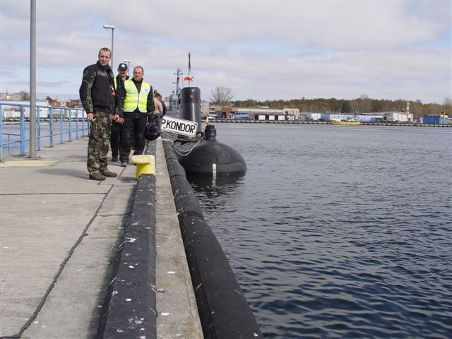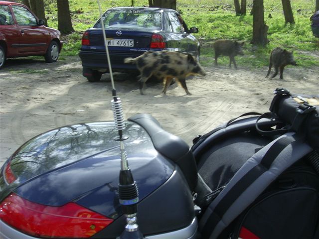 Jedziemy fantastyczna trasą do Krynicy Morskiej rozświetloną roztańczonym słońcem w konarach drzew. Potem kierunek Piaski, ale tu już 10 km asfaltu z łatami i dziurami, potem po betonowych płytach i za radą miejscowego w górę wydmy przez las… Widzimy już na horyzoncie kawałeczek morza… ostatnie piaszczyste wzniesie i się zakopujemy w piasek. Bandyta i Grand Dink stoją prosto bez centralek, tak się zakopały… Patrzymy gdzie jest Pilot… sto metrów wcześniej rzuciło go na piachu no i prawym bokiem padł sztywno w piach jak Gołota. Pamiątkę tego w postaci piasku do chyba dowiezie do Krakowa w … lusterku…. Zostawiamy sprzęty, 10 metrów i jesteśmy na szczycie wydmy… Fotki, wyciąganie jednośladów z piachu i wracamy tą samą drogą na dół… A tam przy parkingu szaleje grupa … 5 dzików! Ale numer, zatrzymujemy się w bezpiecznej odległości, gasimy silniki i strzelamy… fotki. Pojawił się odyniec… ten to ma szable, może lepiej już sobie pojedziemy…. Jedziemy do Władysławowa (nasza czwórka plus Abach z Mareczkiem bo Pidżamy powiedziały pas… za szybkie tempo), tam czeka na nas super obiad w domowej jadłodajni, gdzie zostaliśmy bardzo ciepło i serdecznie przyjęci przez gospodarzy. Potem kierunek Hel. Wpadamy do portu (przycumowana tam była łódź podwodna), idziemy na falochron, oczywiście fotki… Potem żegnamy się z kolegami z Trójmiasta. Jedziemy w stronę Ustki, mrużąc oczy przed słońcem, które teraz ciągle mamy wprost przed sobą. Potem bez żadnych przygód docieramy do Darłówka, gdzie po krótkim błądzeniu odnajdujemy nasze miejsce noclegu. Po godz. 20:00 pojawia się Jerzyk ze Szczecina na swoim Burgmanie. Jutro zrobi z nami część trasy. Rafałek zdecydował się jechać dalej, wcześniej miał w planach po Darłówku wracać do domu.