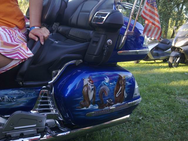 Niekwestionowaną gwiazdą zlotu była nasza perełka Klubowa- Yamaha Morphous, którą dumie przemieszczał się po terenie dr.big. Chętnych do wykonania zdjęcia obok lub za sterami Morphousa było bez liku… nawet cena 5 eur za fotkę nie odstraszała zlotowiczów z Niemiec 😉 Inną gwiazdą był Orzech który robił nam dobrze … znaczy się chłodził … chłodził okoliczne trunki w swoim kufrze wypełnionym lodowatą wodą! No cóż, potrzeba jest matką wynalazków :).