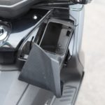 SW: W nowym T-MAXie mamy dwa schowki i oba mogą być pewną niespodzianką. Schowek lewy jest w zasadzie szufladką. Uważam to za genialny pomysł i chwaliłbym bez opamiętania, gdyby nie fakt, że nie zmieści się w niej prawie nic. Zapomnijcie o 4” smartfonie! Wejdzie pewnie Nokia 3210 ale niewiele ponadto. Szkoda, że zmarnowano taki fajny koncept. Drugi schowek, po prawej stronie, jest z kolei zamykany na kluczyk, co jest pewnym novum – na pewno dla posiadaczy najstarszej generacji. Schowek jest rozsądnie duży, umieszczony pod stromym kątem i dość pewnie zamykany. Wejdzie smartfon, Nokia i paczka papierosów i jeszcze zostanie miejsce na szmatkę do przetarcia lusterek.