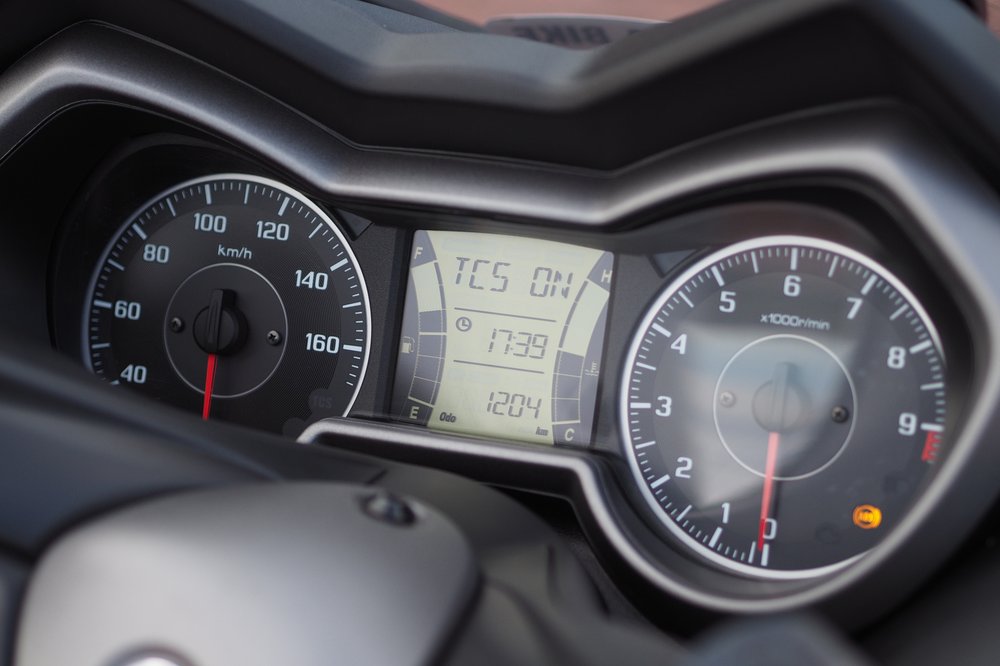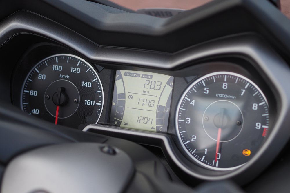 Kokpit skutera i zegary to powiew nowoczesności i ergonomii. Bardzo czytelne zegary, rozbudowany komputer pokładowy mogą być wzorem dla innych producentów. Duże cyfry prędkościomierza i obrotomierza, czytelny wyświetlacz LCD z sensownie zaprojektowamy wskaźnikami jest bardzo wygodny. Na wyświetlaczu możemy sprawdzić czas, temperaturę, przebieg całkowity, średnie zużycie paliwa (w km/l i l/100 km), spalanie aktualne, napięcie ładowanie akumulatora i średnią prędkość. Obsługa komputera jest dość rozsądnie przemyślana i nie ma wielkich niespodzianek, oprócz zmiany miejsca przycisku „passing” – znajduje się on w przełączniku trybu świateł. Rozrusznik zintegrowano w jeden przycisk z odcięciem zapłonu i jest to bardzo wygodne rozwiązanie.