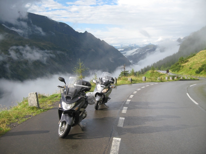 Tego dnia planujemy przebić się przez Alpy i dotrzeć w okolice Marmolady w Dolomitach. Nastoje dopisują wola walki na miejscu. Trasa planowana na prawie 500 km całkowicie po górach. Po śniadanku odpalamy rumaki. Pogoda niezła trochę słońca trochę chmur. Nie za gorąco nie za zimno. Sprawdzenie sprzętów, olej ,opony o’k. Ruszamy do Admont gdzie stajemy napoić pojazdy. Tu małe zdziwko na stacji stoją specjalne dystrybutory dla dwutaktów z różnymi mieszankami paliwo – olej. I nikomu to nie wadzi. Z Admont kierujemy się w strone jeziora Halstatter See. Droga tradycyjnie przepiękna i milusia do jazdy. Objeżdżamy jezioro od południa i w miejscowości Hallstatt wjeżdżamy do tunelu w połowie którego jest parking z przepięknym widokiem na jezioro i okolice. Przez chwile sycimy oczy i karmimy ducha. Dalej na zachód przez przełęcz Gaschutt w kierunku Bischofshofen. Niestety pogoda zaczyna być coraz gorsza, kilka razy zaliczamy małe moczenie ale póki co nic poważnego, Az do teraz. Trafiamy w ulewę jak to w górach mocną intensywna i diabli wiedza kiedy mającą się skończyć. Pod jakimś daszkiem zakładamy kondony pdeszcz. Niestety musimy zwolnić i wzmóc czujność. Włochy oddalają się czasowo. Po godzinie jazdy w deszczu stajemy na jakieś małe co nie co. Knajpa **** wypas i szyk. Ale jakoś nikomu mnie przeszkadzamy w mokrych i cieknących ciuchach, cóż knajpa jest „Bikers Friendly” i tak faktycznie jest. Mam nadzieje, ze w trakcie naszego lunchowania deszcz pójdzie sobie gdzieś w diabły. Niestety nie poszedł, co więcej przyprowadził kumpli wiec teraz leje jeszcze intensywniej. Odwlekamy jak możemy wyjście z ciepłej i suchej knajpy ale moment ten w końcu nadchodzi. W strugach wody jedziemy dalej w kierunku Zell am See. W Zell zaliczamy ciekawe zjawisko w tunelu, momentalne zaparowanie wszystkich szyb (kask, lusterka, szyba, zegary) Wrażenie średnio ciekawe gdy przy 70 km/h traci się kompletnie wizję w ułamku sekundy. Tak szybko jeszcze nie otwierałem szyby w kasku jak żyję. Przed nami najciekawszy punkt podróży przełęcz Grossglockner, gdzie wjazd kosztuje dla moto 18 eur, katamaran 28. Wjeżdżamy wciąż w strugach deszczu. Po kilkunastu serpentynach wypadamy ponad chmury. Banany na naszych ryjkach rosną w oczach. Widoki nie do opisania podkręcone dodatkowo przez grę słońca, chmur, szum spadających z okolicznych lodowców wodospadów i świst świstaków , które na tę okazję przestały na moment zawijać sreberka . Docieramy na szczyt przełęczy i decydujemy się odbić jeszcze wyżej na szczyt Edelweisspitze Coś o edelweisspitze. Na wysokości 2571 npm jest mały raj dla motocykli. Schronisko z darmowymi parkingami NUR FUR MOTOCYKLE. Dla gości darmowy garaż dla moto. W budynku na szczycie małe muzeum motocyklowe związane z drogą Grossgluckner, na każdym płaskim elemencie masa naklejek klubów motocyklowych z całego świata. Widok dookoła wręcz nie do streszczenia. Niestety dopada nas rzeczywistość. Olek dostaje info od lepszej połowy że ich młody niezdrów jakiś i wylądowali w szpitalu. Olek wprawdzie gra twardziela i wygłasza tezy że to wszystko nadgorliwość lekarzy z Medicoveru ale widać że humor mu się zważył. Włochy i tak już nieosiągalne, kiedy zjeżdżamy z przełęczy w stronę Winklern słońce chowa się już za góry. Deszcz i czas spędzony na szczycie Edelweiss robią swoje. Nie jesteśmy także pewni czy nie będziemy musieli wracać na łeb na szyję ze względu na młodego Olka. Temperatura powoli spada w dół. Wprawdzie deszcz już nie wrócił ale 8 gradusów to wiele nie jest zwłaszcza że mamy jednak po całym dniu wilgotne ciuchy. W Winklern bierzemy pierwszy przy drodze Hotel, ale za to z praktycznie własnym garażem dla sprzętów. Olek odpływa w wir wiadomości do i od żony ja powoli uderzam w kimono. To był super dzień pomimo deszczu. Zrobiliśmy wprawdzie niewiele, bo około 300 km ale widokami i wrażeniami można by obdzielić kilka wypraw.