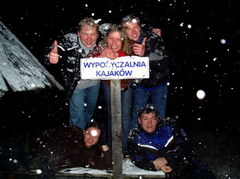 Z pewnością zaskoczył by wszystkich świat jaki zastaliśmy na zewnątrz. Coś było nie tak, albo zajechaliśmy dalej niż sądziliśmy, albo coś w było spożywanym piwie. Wokoło było biało, a do tego z nieba sypało jak cholera. Otrząsnęliśmy się jednak szybko tłumacząc, że jest to z pewnością ocieplenie. Lekki mrozik jaki towarzyszył nam tego dnia i jaki zmroził lokalną drogę do hotelu, o której już wspominałem, właśnie odchodzi w niebyt. Ciesząc się z poprawy pogody zwiedziliśmy okolice. Chodząc brzegiem jeziora zauważyliśmy wielki skrzek, choć część z nas twierdziła, że jest to zamarzające jezioro. Nie byliśmy jednak do końca pewni co to i co z tego się może wykluć więc, na wszelki wypadek podeptaliśmy go dokładnie. Sprawdziliśmy się w roli skejciarzy, zwiedziliśmy zaklęty las , w którym huśtawki się urywają Początkowo lekceważyliśmy sobie te wszystkie ostrzegające sygnały otoczenia. Nawet wypatrywanie nadciągającego niewiadomego nie dało większego efektu. Mimo, że mieliśmy kąpielówki postanowiliśmy nie pływać a to z powodu wspomnianego już skrzeku a to z powodu słabej widoczności i obaw czy aby przyroda nie chce nas przed czymś ostrzec. Spotkaliśmy też wiele mówiącą tabliczkę. FOTO ZAKAZ Powoli zaczęło to do nas docierać – byliśmy w niebezpieczeństwie, nie powinniśmy go drażnić.
