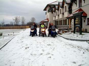 Ostatnie 100 metrów na drodze do hotelu okazało się wyjątkowo ciężkie do przejechania. Starając się jechać po miękkim, lub w pozycji rozkraczonej żyrafy doślizgaliśmy się na podjazd, który żebyśmy się jeszcze nie nudzili, wysypany został drobniutkimi otoczakami. Wykopane w ten sposób rowy starannie później przysypaliśmy tłumacząc właścicielowi, że burgmanoloty tak mają – jak ruszają to zdecydowanie. Po zakwaterowaniu i zdjęciu wierzchnich warstw ubrań poszliśmy do jadalni gdzie pewien gatunek wody przywrócił nam nadzieję na ocieplenie i chęci do życia. Kominek radośnie płonął a my pochłanialiśmy wszystko co było podawane w ramach obiadokolacji. Po niej z przerażeniem stwierdziliśmy, że jest ledwo po południu i nie wyobrażamy sobie nie jeść aż do jutra. Na szczęście bar został otwarty i niebawem nie martwiliśmy się pustymi żołądkami ani niczym szczególnym. Kominek, dobre piwko i wyborne towarzystwo sprawiły, że ani się obejrzeliśmy jak na zewnątrz zrobiła się noc. Ustaliwszy z obsługą godzinę kolacji wyszliśmy na spacer.