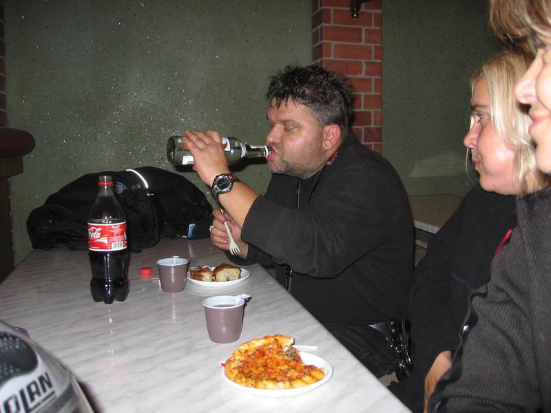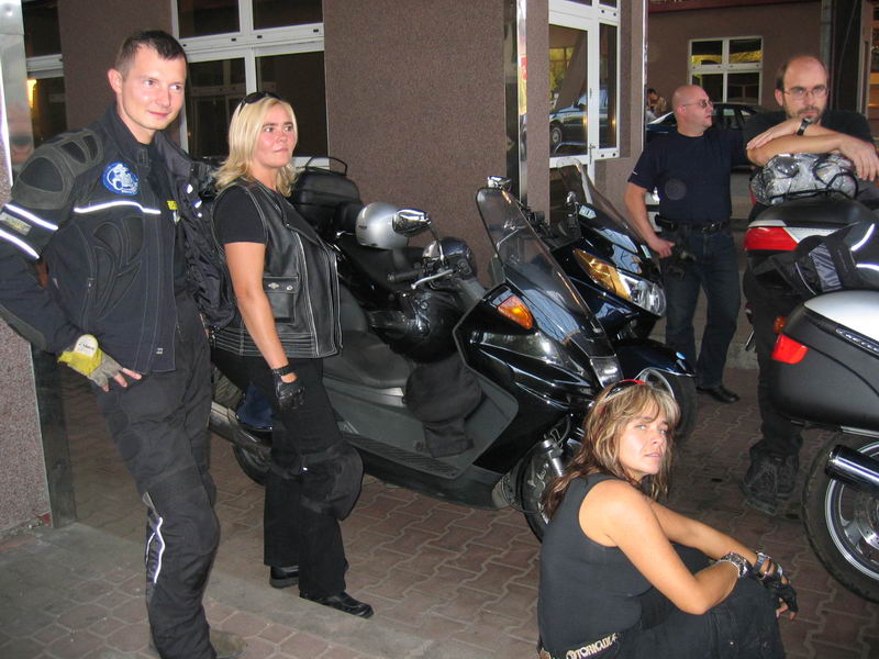 Po zatankowaniu naszych sprzętów postanowiliśmy jeszcze zatankować nasze wygłodniałe żołądki. Podjechaliśmy do Brześcia na fast food ford białoruskim wydaniu. Miasto mimo późnej pory tętniło życiem. Szybki posiłek i w drogę, przed nami jeszcze 180 km drogi. Noc była gwiaździsta, a my gnaliśmy w zupełnej ciemnicy całkiem niezłą drogą. Kiedy dojechaliśmy do bramek na autostradzie zatrzymaliśmy się żeby wyjąć kasę. Okazało się, że nie musimy płacić, szlaban poszedł w górę. Pierwsi przejechali Kris i Mario, za nimi chciał przelecieć Mutek i w tym momencie szlaban przypominający szynę kolejową nagle opadł, żeby nie skrócić się o głowę Mutek ostro zahamował i w tym momencie Magda która chciała równie szybko przelecieć nie zauważyła ostrego hamowania. Efekt był taki że wjechała w tył Mutka, postała chwile i upadła na bok. Mutek stracił klosz kierunkowskazu, natomiast u Magdy popękały plastiki z przodu. Posklejaliśmy je na szybko taśmą i pojechaliśmy dalej. Grunt ze nikomu nic się nie stało, a uszkodzenia pozwalały na bezproblemowe kontynuowanie jazdy. Temperatura mocno spadała za sprawą mgły gęstej jak mleko, a my chcieliśmy być już jak najszybciej na miejscu. Kiedy tak jechaliśmy w zupełnym mroku, nawet z oddali nie było widać jednego światełka przypominającego, że mogą gdzieś tu mieszkać ludzie a ostatnią stację benzynową minęliśmy około 100 kilometrów temu na poboczu drogi zobaczyliśmy kobietę ubraną w letnia sukienkę która łapała stopa. Jeszcze długo się zastanawialiśmy skąd się wzięła na tym pustkowi w środku nocy.