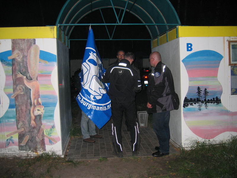 W końcu otrzymaliśmy upragnione klucze od domków. Przewrócony Toy Toy, tak je ochrzciliśmy. W środku było schludnie, choć surowo. Grunt, że było gdzie spać, tylko że nie przyjechaliśmy tam przecież spać. Wyciągnęliśmy od razu nasze zakupione wcześniej wiktuały rozpoczęliśmy biesiadę. Część zlotowiczy albo już wstała albo jeszcze się nie położyła, więc przy gitarze elektrycznej bez prądu balowaliśmy hmm i tu powinno być do rana ale my w sumie rano zaczęliśmy, bo zaczęło się już przejaśniać i powoli z mroku zaczęło wychodzić słońce. Zresztą pierwsza rzeczą jaką zrobiliśmy dostając klucze do legolandów było powieszenie naszego klubowego banera Burgmanii. Marzyliśmy jeszcze o prysznicach, niestety okazało się, że to zbytni luksus i wymagamy za wiele. Prysznic co prawda był ale z lodowatą wodą, a my byliśmy trochę przemarznięci.